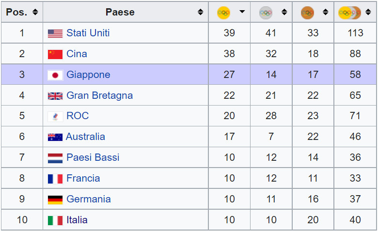 Tirando le somme, l’Italia termina decima nel medagliere finale, saldamente dietro Paesi Bassi, Francia e Germania che, bisogna dirlo, hanno lo stesso numero di ori (10) ma meno medaglie complessive dell’Italia. Il Giappone, come da copione, riesce ad essere sul podio in quanto paese ospitante. In parabola discendente anche la Gran Bretagna che per un centesimo ha perso il 23o oro.