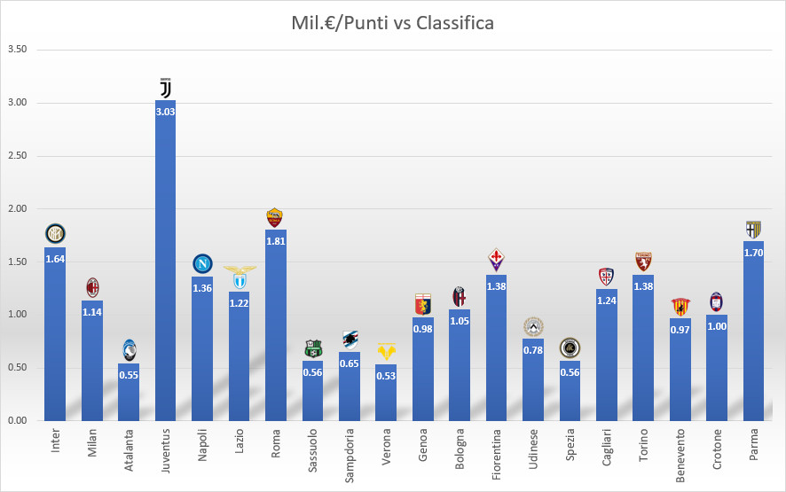 La Juve è la squadra che ha speso più di tutte, con circa 3 milioni per ogni punto realizzato alla fine. Quasi il doppio della seconda classificata, la Roma. Sorprendentemente male si piazza il Parma che che una media di conversione punti abbastanza alta si è piazzato in ultima posizione con soli 20 punti realizzati. Bene fanno anche Torino e Fiorentina anche se non centrano coppe.