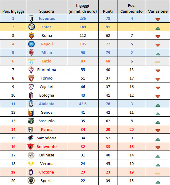 Nelle prime tre posizioni di chi ha speso di più troviamo Juve, Inter e Roma. Mentre Juve ed Inter sono riuscite a centrare la zona champions (e l’Inter a vincere il campionato), la Roma si ritrova al di sotto della zona coppe europee, al settimo posto. Napoli, Milan e Lazio, fanno bene ma è decisamente l’Atalanta la più virtuosa.