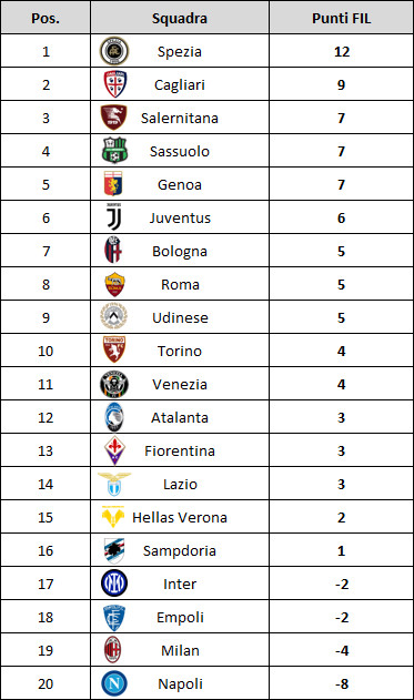 Ricordiamo brevemente il regolamento del FILometro: dopo ogni giornata di campionato di Serie A, la FIL assegna in maniera assolutamente insindacabile punti lose in base alla prestazione di ogni squadra. La cosa divertente è che la FIL premia chi fa più schifo o chi fa cose mirabolanti, tipo sbagliare rigori, sbagliare tutto sotto porta oppure perdere pur avendo il 70% di possesso palla e chi più ne ha più ne metta.