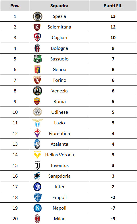 Pensiamo poi proprio all’Inter che non riesce a vincere con la maglia pitonata ed all’Empoli finora incredibilmente graziato dalla lose. Al Napoli che raccoglie i primi punti della stagione. E soprattutto a Spezia, Cagliari, Salernitana e Sassuolo che si danno battaglia in cima al nostro FILometro.