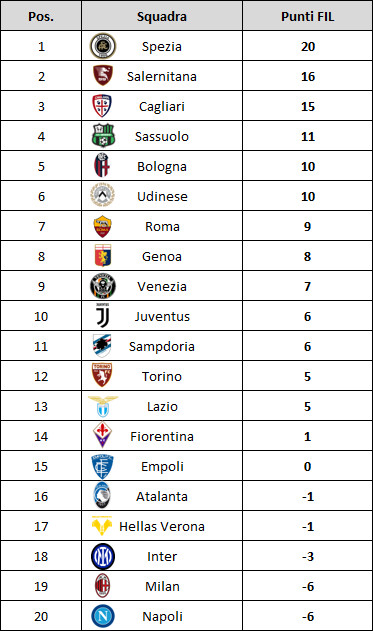 Lo Spezia allunga mentre Cagliari e Sassuolo perdono leggermente contatto con il gruppetto di testa. Ma la vera novità è la prima sconfitta stagionale in Serie A di Milan e Napoli che in un solo colpo guadagnano un bel gruzzoletto di punti lose, ma rimangono saldamente sul fondo del nostro FILometro.