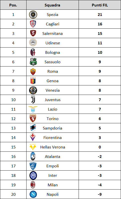 Il FILometro vede lo Spezia sempre solitario in testa, Cagliari e Salernitana che fanno scambio posizione e l’Udinese, alla ricerca del record pareggi, che fa capolino dietro il terzetto di testa. In coda Empoli a sorpresa piomba ancora più giù e l’Atalanta che in questa giornata passa in debito con la lose.