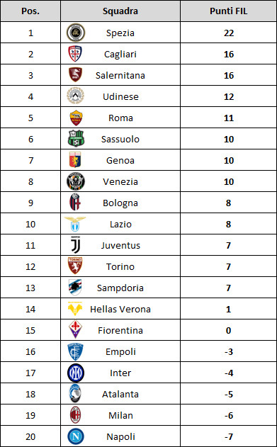 Continua la fantasmagorica progressione di Roma e Udinese, ormai a ridosso dell’imprendibile terzetto di testa, capitanato dallo Spezia, sempre più solo in vetta. In basso invece vediamo piombare sempre più in basso l’Atalanta che si fa superare addirittura dagli altri nerazzurri, ed ormai ad un passo dal fondo, occupato stabilmente dal Napoli di Spalletti. L’oscar dell’equilibrio questa giornata lo vince la Fiorentina che guadagna la quindicesima posizione con zero punti.