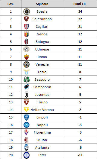 Ecco che la Salernitana inizia seriamente ad incalzare lo Spezia ora a sole due lunghezze. Continua l’ottima progressione del Cagliari di Mazzarri che si fa impallinare in casa dall’Udinese. Il Napoli prova a risorgere mentre l’Inter piomba di nel baratro dell’anti-lose.