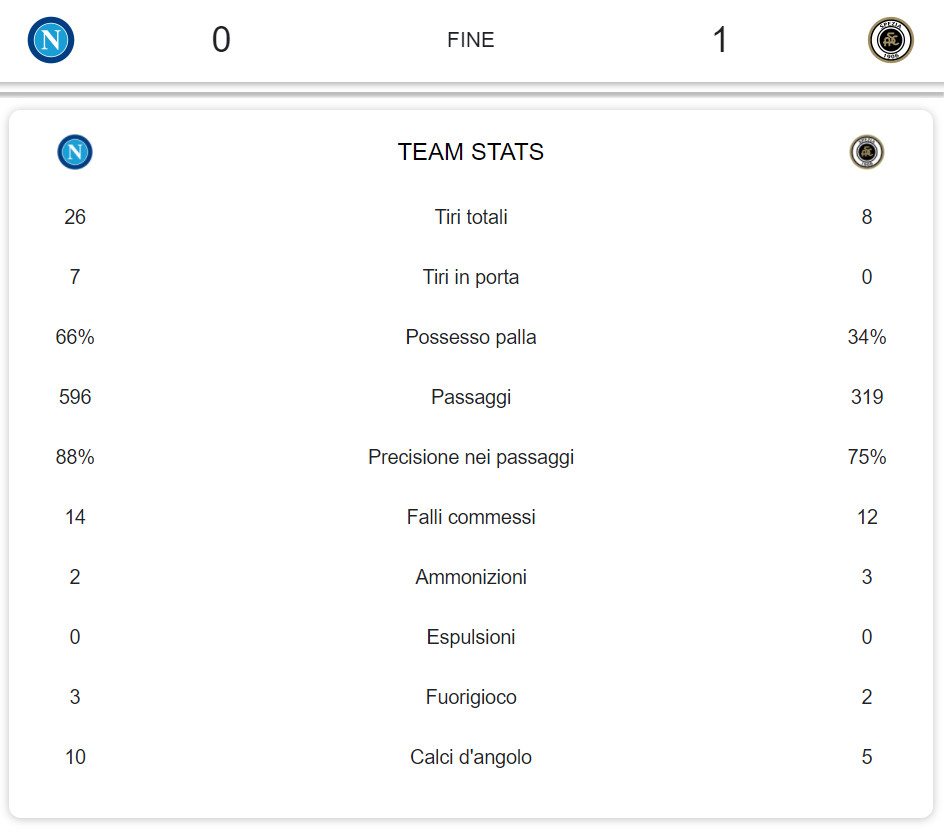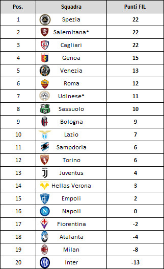 Napoli (+3 pt): Il Napoli ci regala questo capolavoro e contemporaneamente toglie anche la vetta solitaria del nostro FILometro allo Spezia. La domanda è: si può perdere una partita sulla carta “facile” senza mai far tirare in porta gli avversari? La risposta è un grande SÌ. Per i dettagli chiedere a Juan Jesus (siamo quasi a Natale del resto) e a Spallettone che si suicida con metodo svizzero. Sia come sia questi sono tre punti lasciati sul terreno che sicuramente peseranno alla fine del campionato.