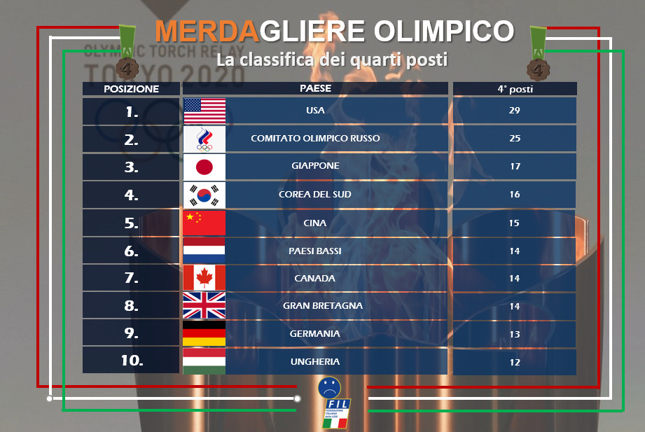 Come abbiamo visto nel post precedente della nostra rubrica Statistiche inutili dedicate a queste Olimpiadi, l’Italia con il suo record di medaglie si è piazzata decima nel medagliere finale, saldamente dietro Paesi Bassi, Francia e Germania che, bisogna dirlo, hanno lo stesso numero di ori (10) e meno medaglie complessive dell’Italia. A questo punto ilContinua a leggere “Statistiche inutili – Medaglieri alternativi”